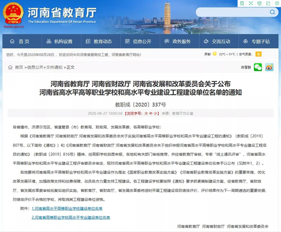 “高职双高工程”是落实《国家职业教育改革实施方案》的重要举措,是职业教育“下好一盘大棋”的重要支柱,将引领职业教育新一轮改革发展。河南省“高职双高工程”项目建设申报启动于2019年。经过学校自愿申报、有关部门审核推荐及省教育厅审核,专家线上评审,评审委员会审定,最终立项高水平高等职业学校和高水平专业建设工程建设单位88个,其中34所高水平高等职业学校和54个高水平专业群。